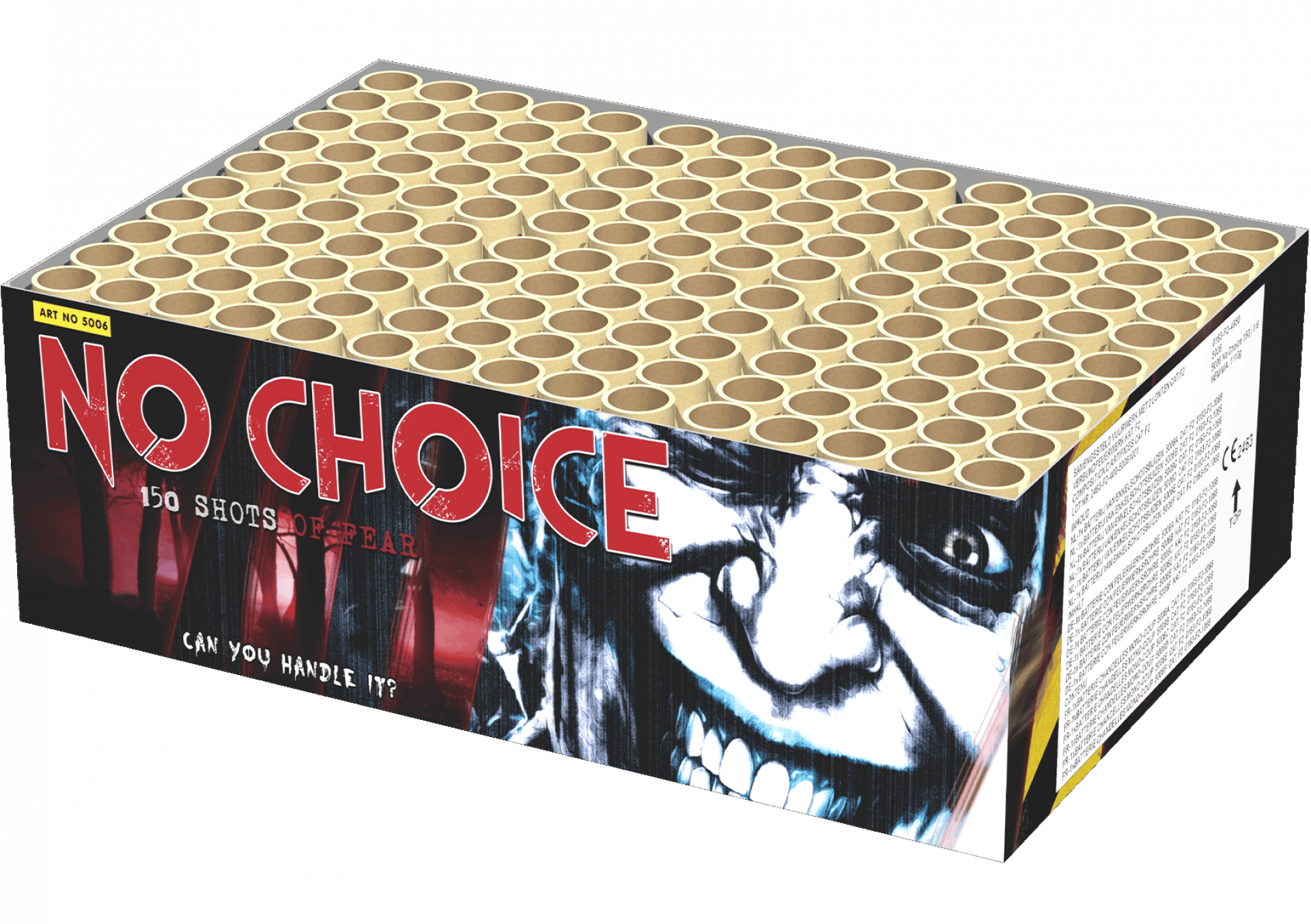 Met No Choice hoef je geen concessies te doen: deze 150-schots, 500 GRAMS cake, biedt een veelzijdige show met silver waves, red dahlias en green glittering peonies. De afwisselende effecten in een dynamisch ritme houden de lucht constant gevuld met spectaculaire kleuren en flitsen. Een overtuigend alles-in-één vuurwerk.