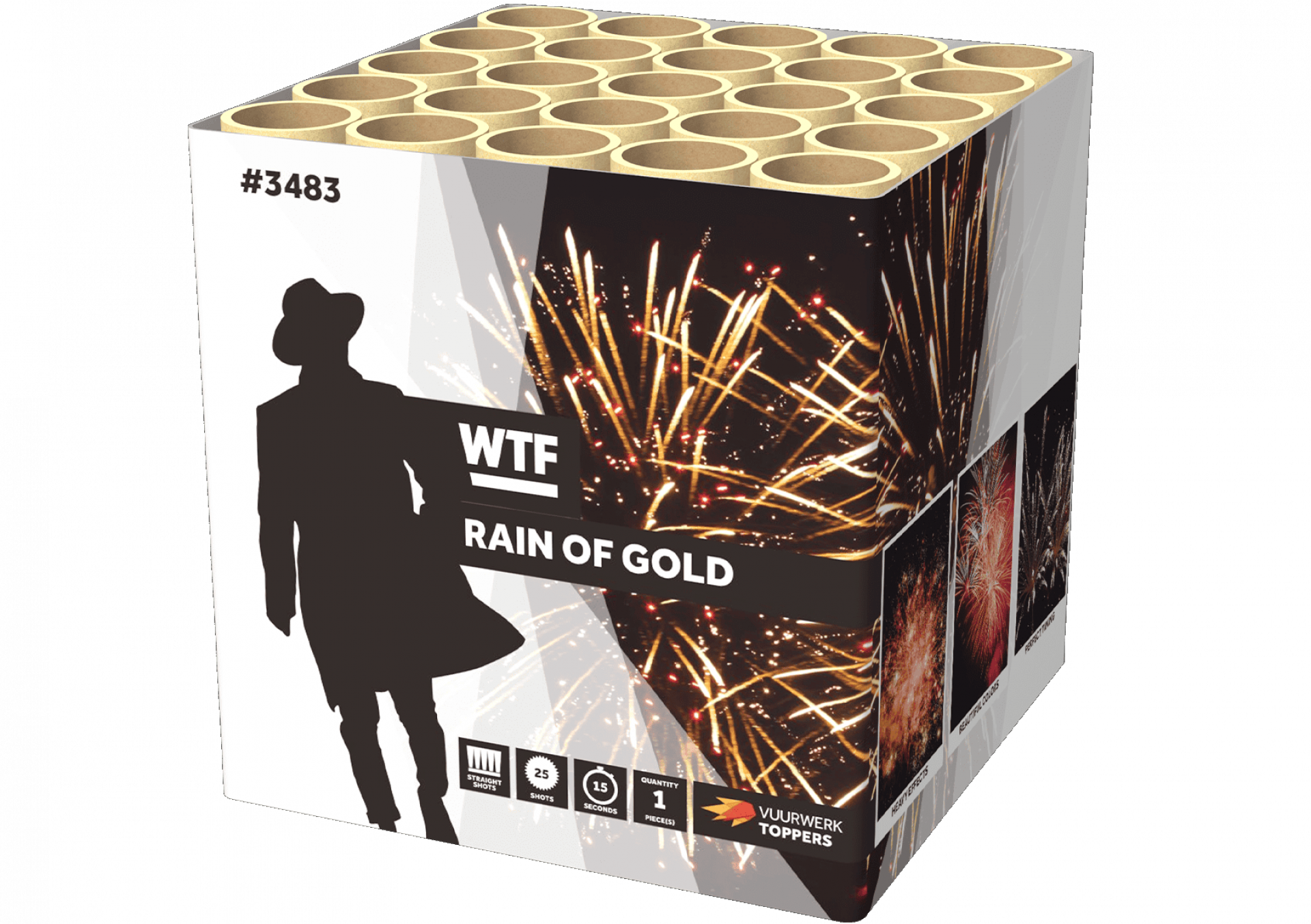 Goudgekleurde mijnen worden opgevolgd door gouden glitter, blauwe, paarse, gele en rode sterren en eindigen in een ongekende finale! De 25 schoten in deze cake worden in een spectaculair salvo afgevuurd!